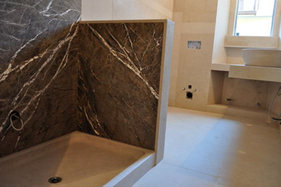 Rivestimento e piatto doccia in Pietra di Modica Antique e Forest Brown